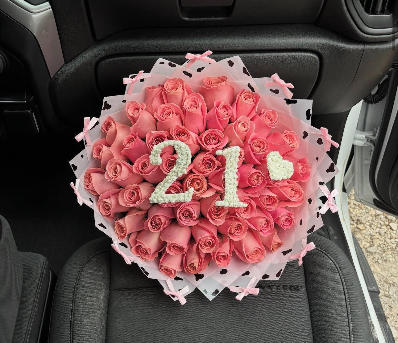 Celebrate a big moment with 50 perfectly arranged pink roses, wrapped in heart-accented paper and topped with dainty pink bows. The “21” is a playful touch, that can be customized.