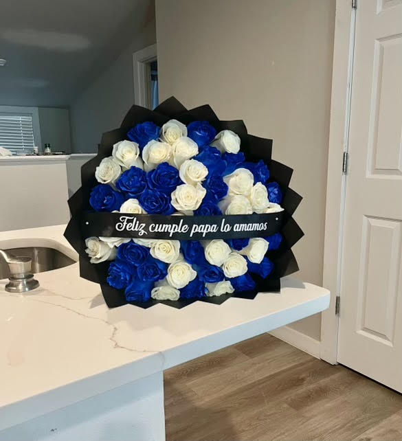 A graceful combination of blue and white roses, wrapped with a personalized ribbon. Soft, sophisticated, and perfect for a meaningful gift.