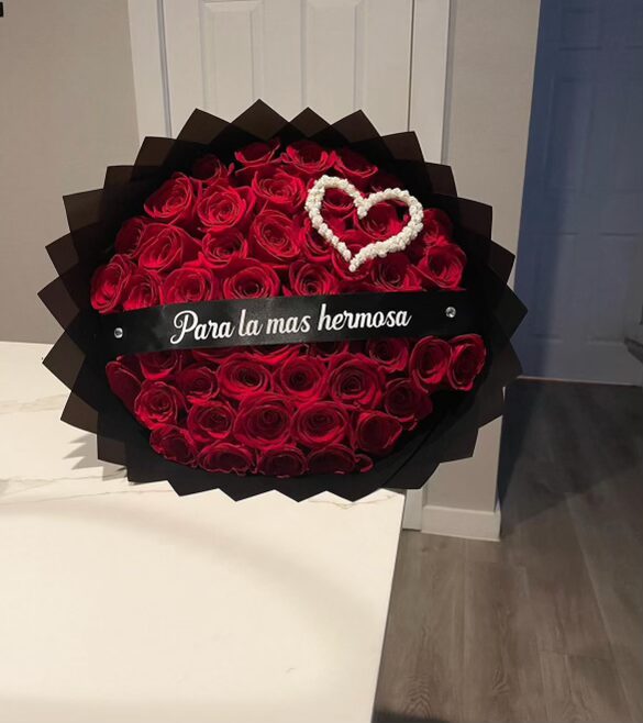 Express your love with this stunning bouquet of 50 roses, featuring a small heart-shaped arrangement of baby’s breath, and finished with a personalized ribbon and bow. The perfect heartfelt gift for any special occasion.