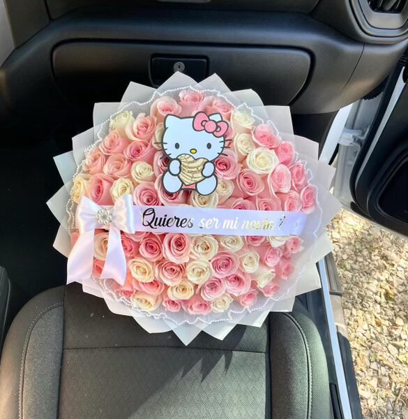 This charming bouquet features 75 mixed off-white and pink roses, elegantly arranged with a personalized ribbon and a delightful Hello Kitty design. A perfect blend of sweetness and elegance, ideal for any occasion.