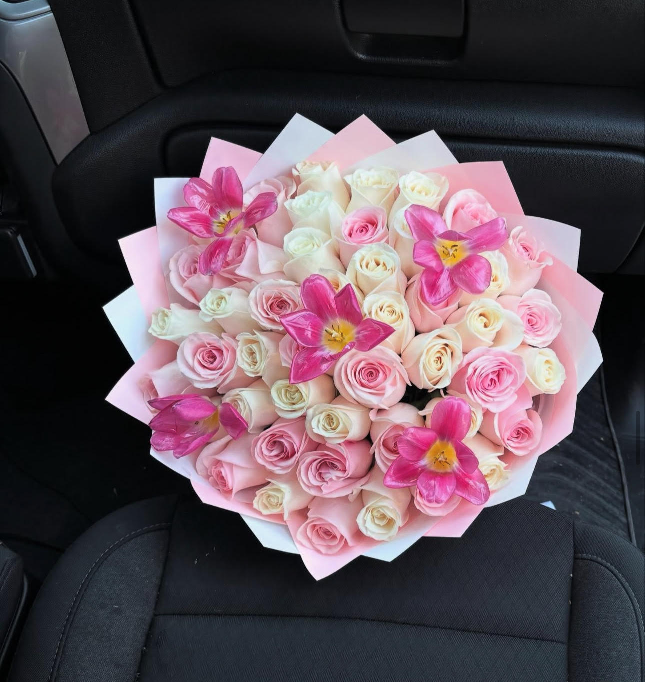 Soft, dreamy, and full of love. This bouquet blends 50 blush, cream, and baby pink roses with pops of pink lilies. Wrapped in pastel-toned paper and soft elegance, perfect for birthdays, anniversaries, or just showing love.