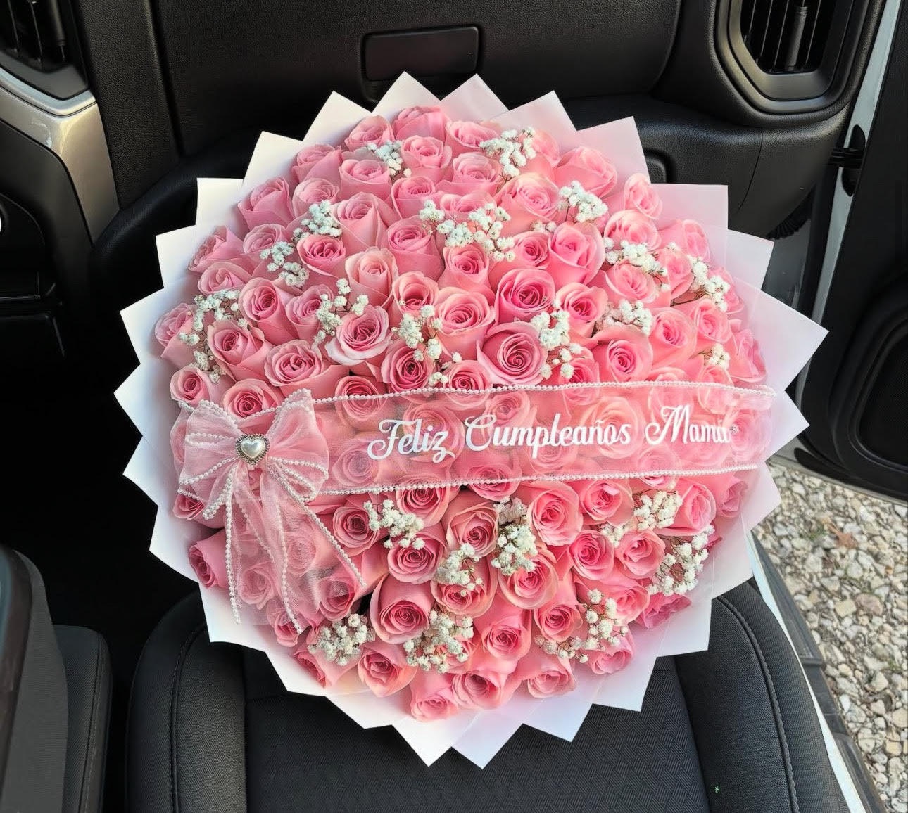 An extra full bouquet of 75 soft pink roses with delicate baby’s breath, wrapped with care and topped with a soft tulle bow.