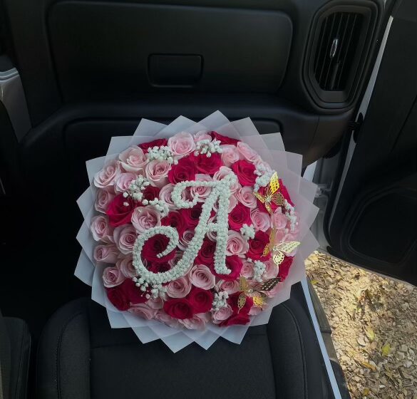This stunning bouquet features 75 vibrant pink and soft pink roses, beautifully mixed with baby’s breath and accented with 3 gold butterflies. Perfect for making any occasion extra special!