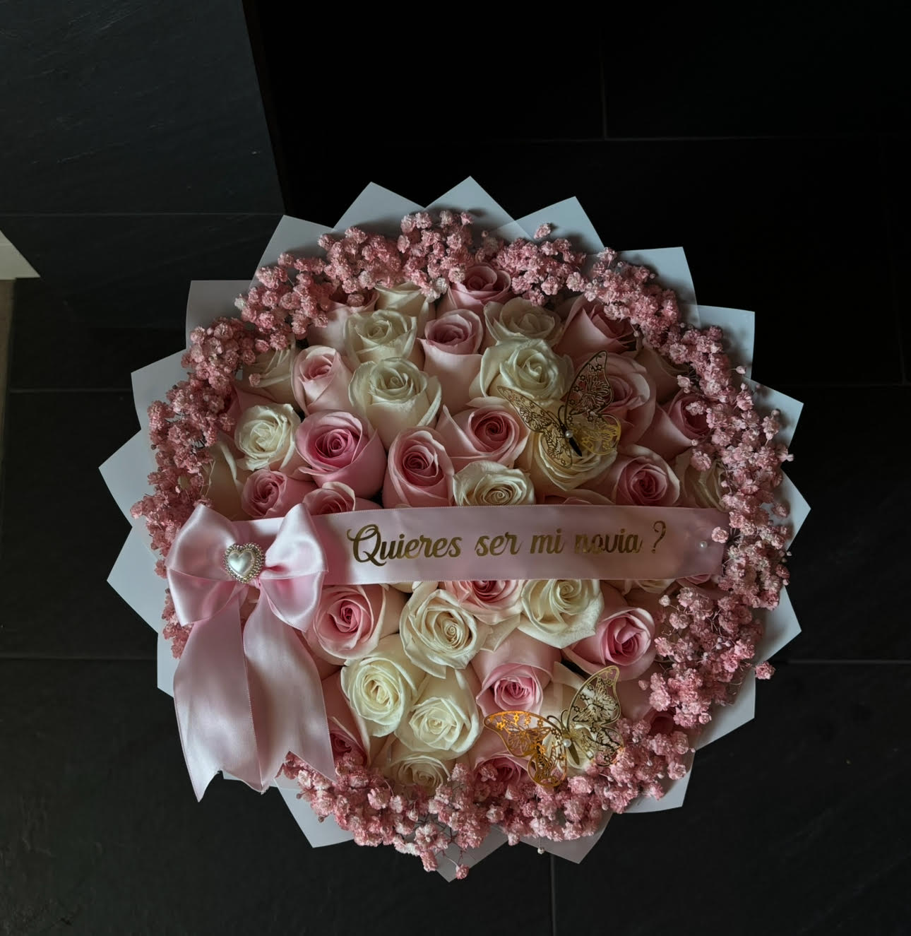 A delicate and romantic arrangement of 50 blush and ivory roses, wrapped in love and sprinkled with pink filler flowers and golden butterflies. The satin ribbon says āĀæQuieres ser mi novia?ā but can be personalized with your own message in the box below. Soft, sweet, and unforgettable.