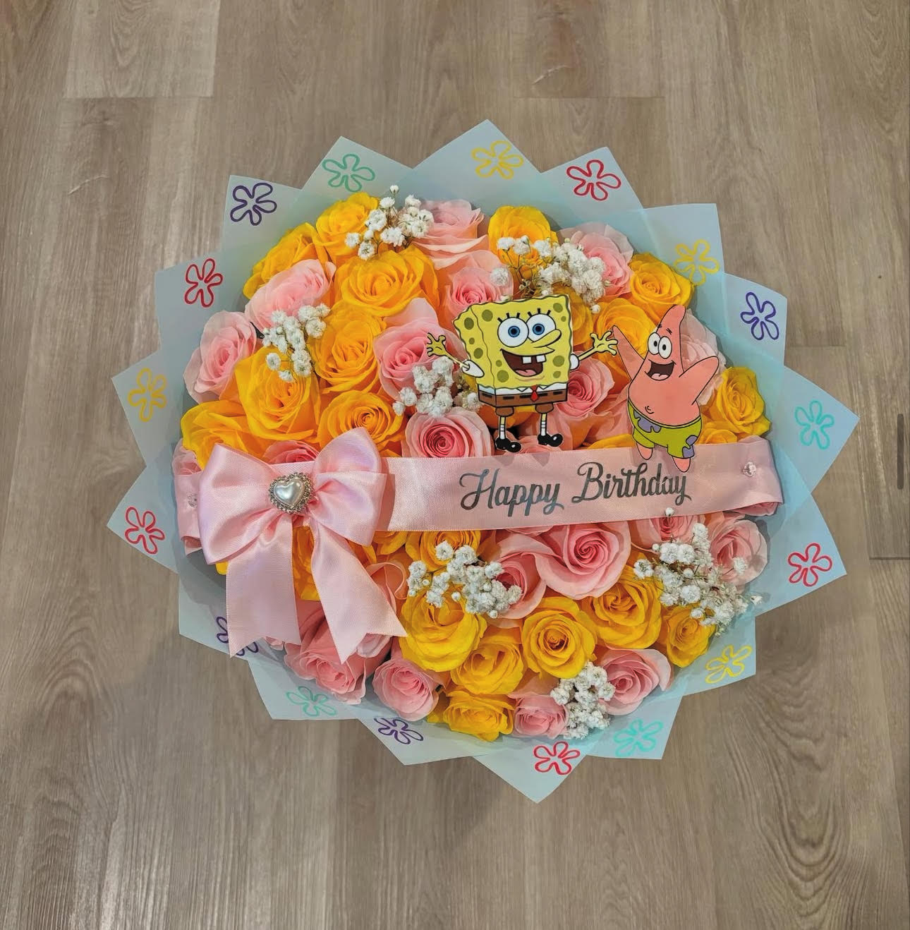 This fun-filled bouquet is bursting with50 mixed pink and sunshine-yellow roses, featuring SpongeBob & Patrick for the ultimate cartoon celebration. Add your own custom ribbon for that silly, smiley personal touch. Perfect for kids, besties, or your inner child.