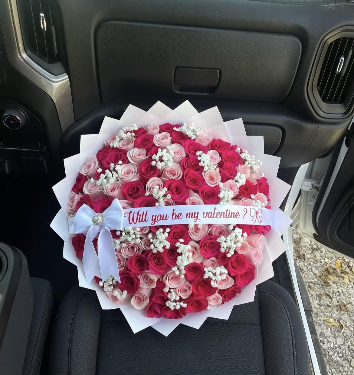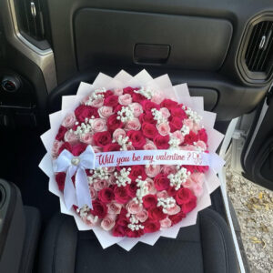An exquisite 100-rose bouquet featuring a stunning mix of vibrant pink, light pink, and white roses, accented with babys breath. Completed with a personalized ribbon, this bouquet is a heartfelt way to brighten someones day.